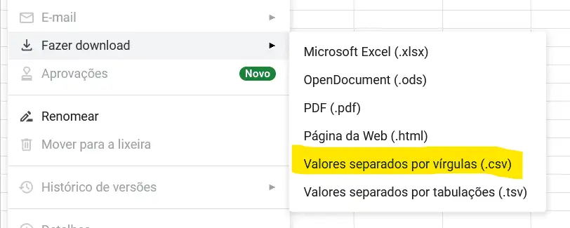 Abaixo, um exemplo de como é possível baixar uma planilha no formato CSV separado por vírgulas, utilizando o Google Sheets